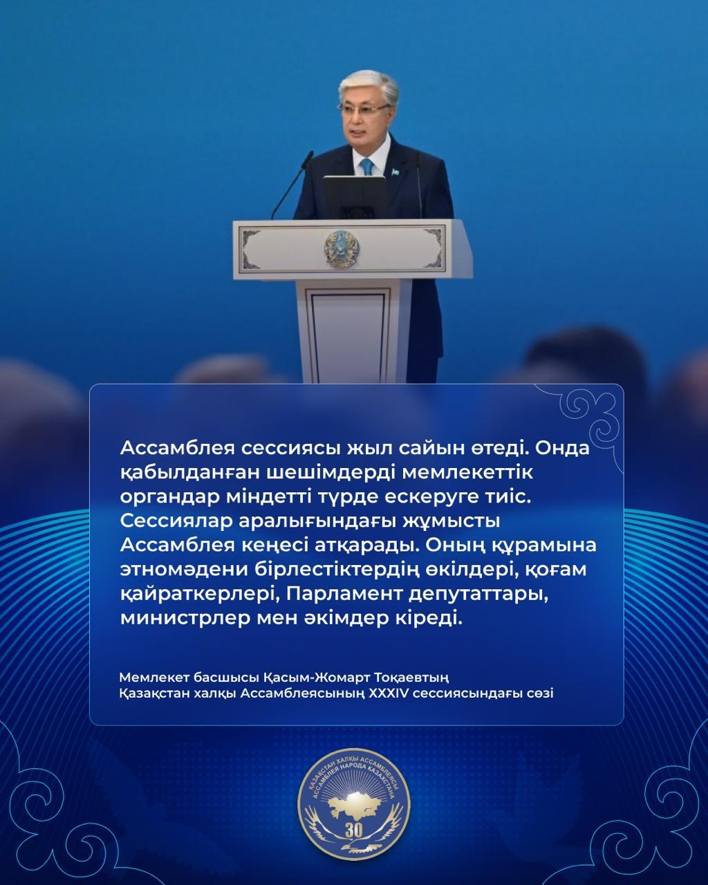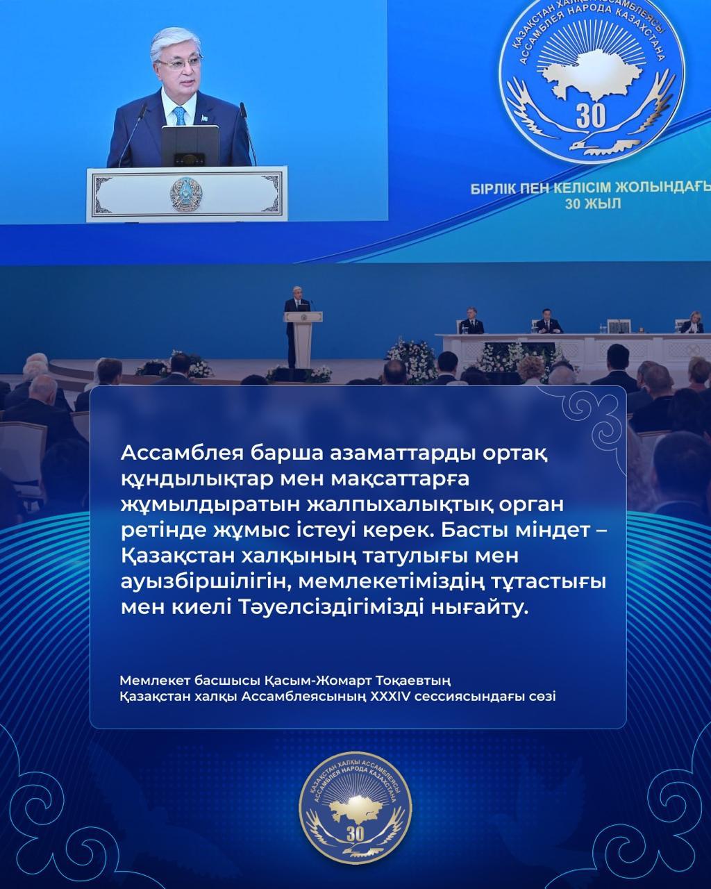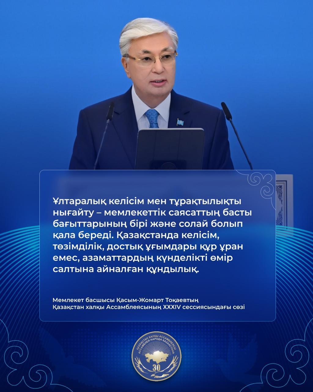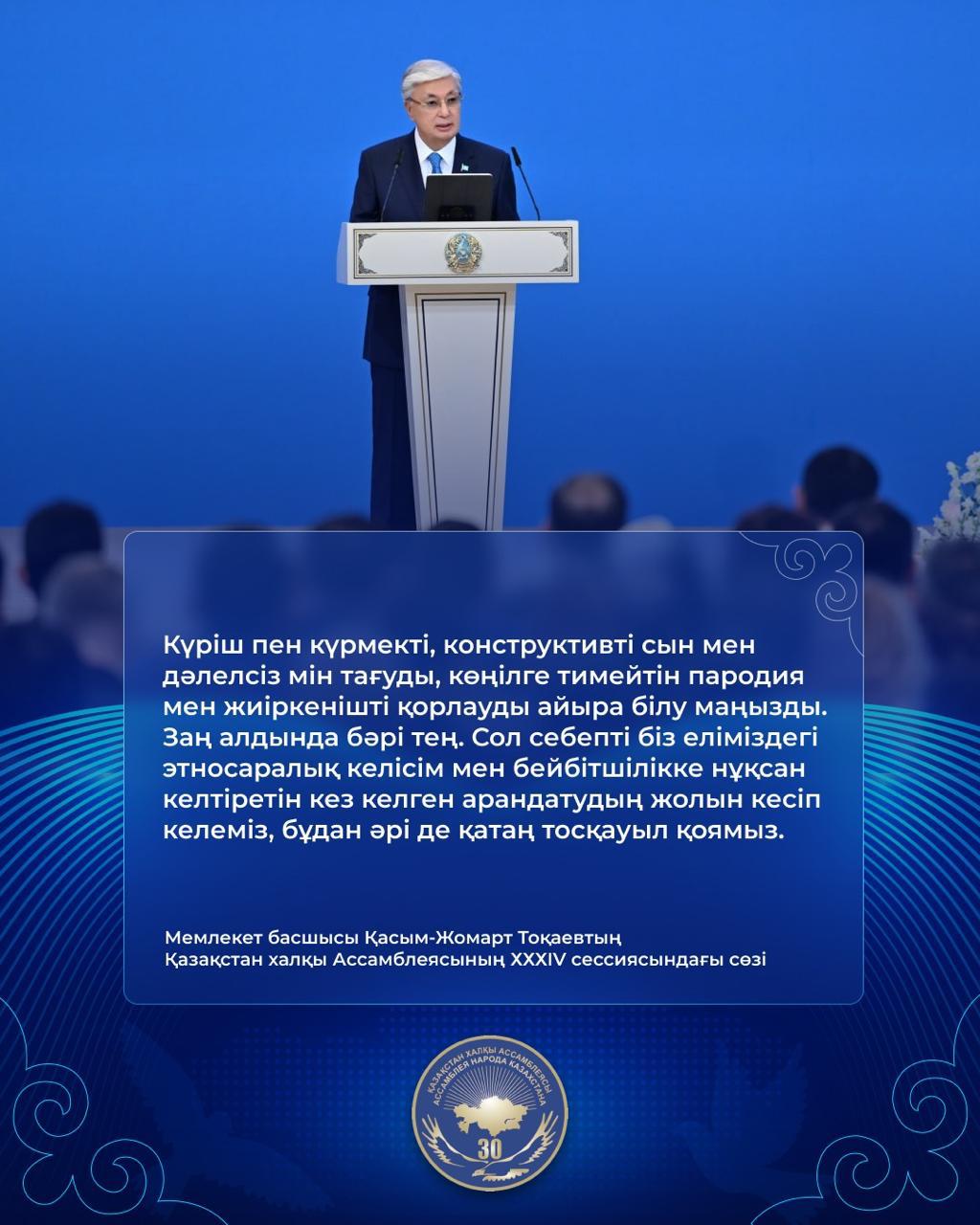 "Қазақстан халқы Ассамблеясының XXXIV cессиясындағы Мемлекеттік басшысы Қасым-Жомарт Тоқаевтің сөзі"